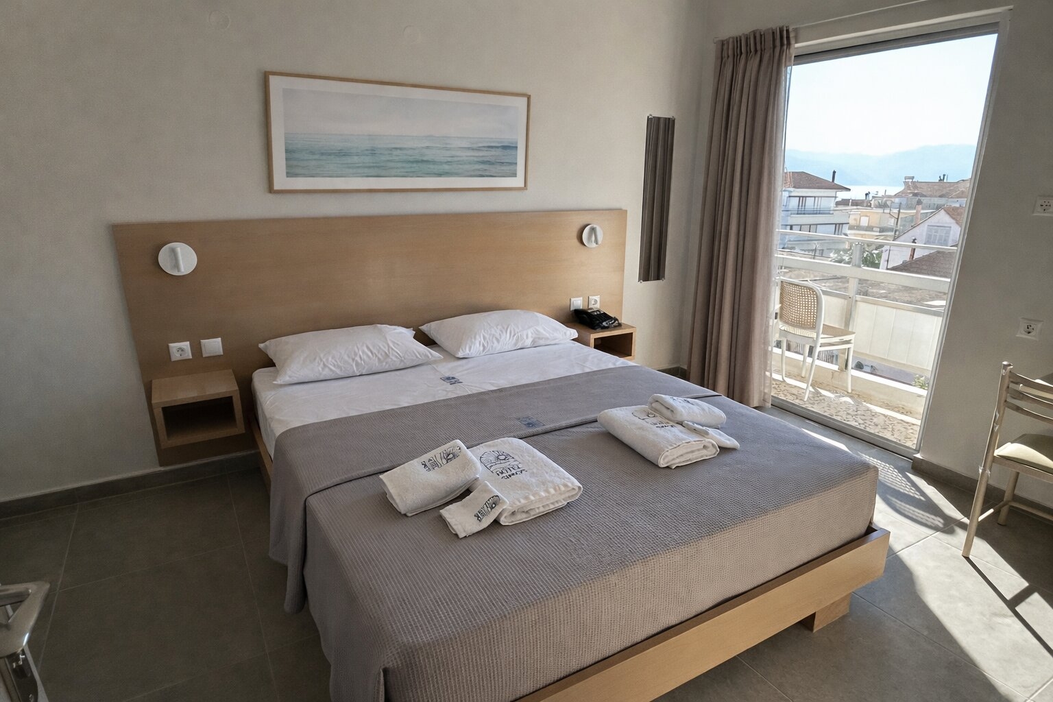 The rooms are bright, airy, and refreshingly simple, letting the real star of your stay take center stage: the view. Step onto your private balcony and you’ll find yourself facing endless blue horizons, olive-green hills, and the calm rhythm of seaside life. Everything is designed for ease, comfortable beds, cool air conditioning for warm Greek afternoons, and Wi-Fi for when you want to reconnect with the world (though you may not feel like it).